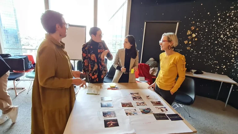 - Réalisation : En équipes de huit personnes, les participants construisent une fresque visuelle en utilisant trois jeux de cartes personnalisés (cas d’usage, conséquences et conditions de succès), favorisant ainsi l’intelligence collective.
